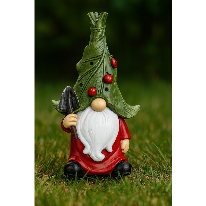 Un Gonk de grădină cu lumină solară puternică. Prezintă în mână o pică și poartă o pălărie de copac.